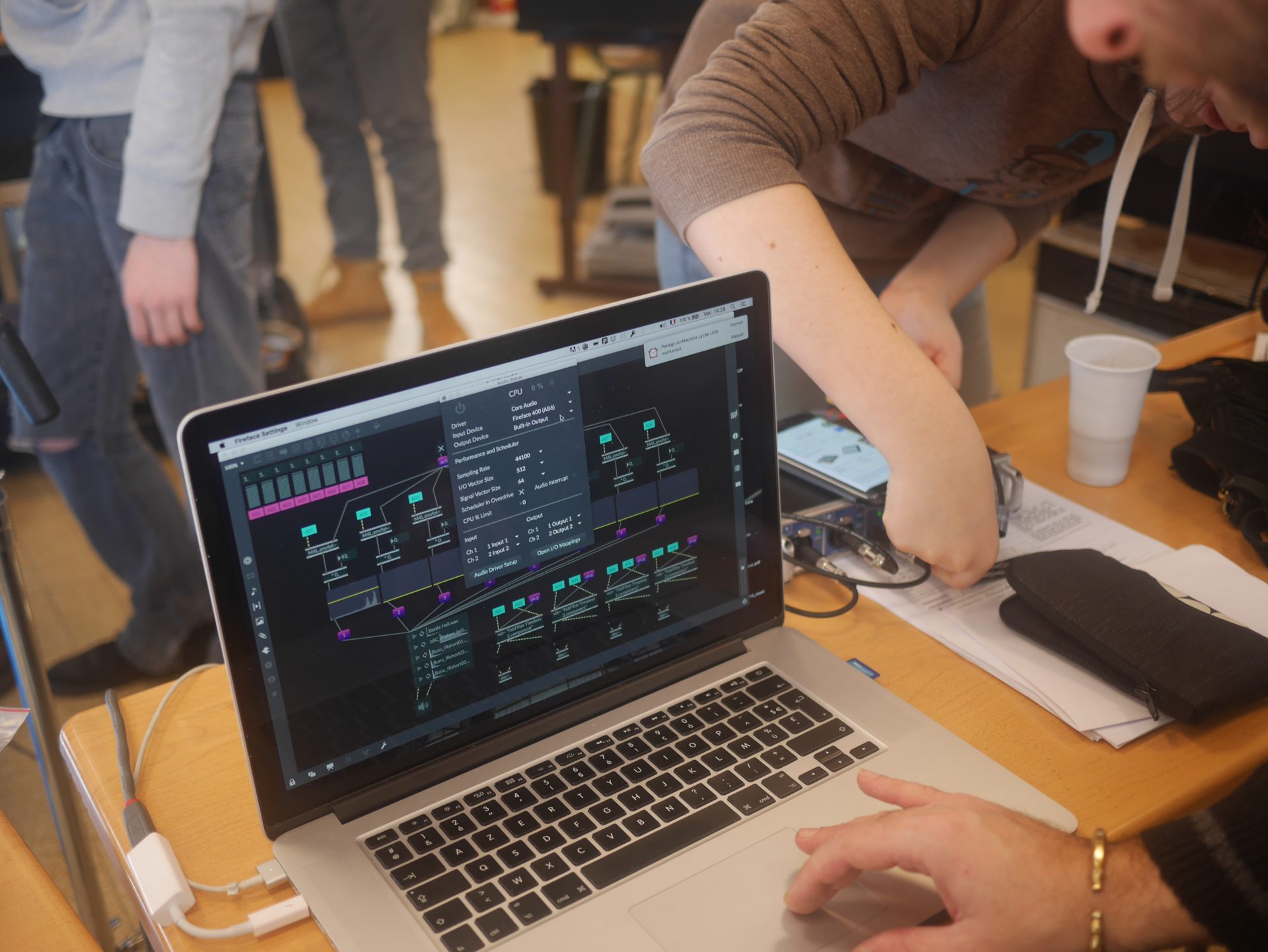 Les répétitions en classe se sont articulées autour du détournement d’objets du quotidien et/ou recyclés et de l’improvisation, avec l’utilisation de l’électronique. Il s’agit également de chercher à connecter le son et les gestes à un dispositif électrique, lumineux et à l’espace. Cette recherche s’est effectuée en coordination avec les différentes matières étudiées par les élèves : ouverture sur la technique en physique, sur la programmation en mathématiques, sur la mise en jeu et l’étude de textes en français.