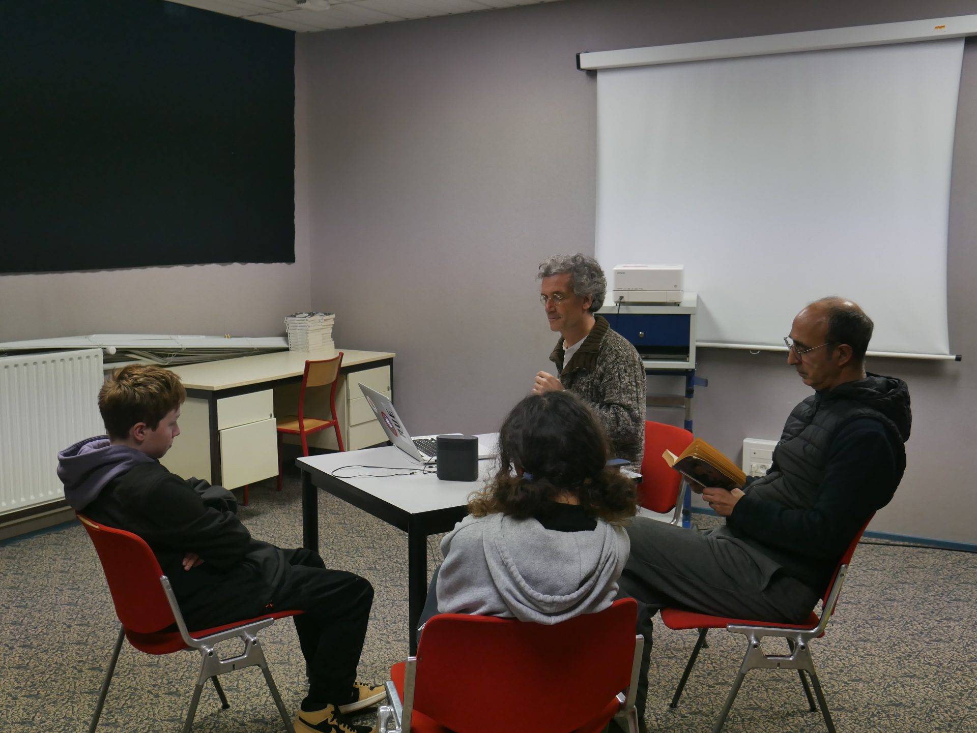 Accompagnés de François Salès, de leurs enseignants M. Boutaleb (lettres/histoire), Mme Touron (arts appliqués) et Mme Humbert (lettres/histoire), ainsi que des documentalistes Mme Cligniez et M. De Bayle Des Hermens, les élèves travaillent à la réalisation d’une exposition immersive avec pour thème la poésie d’Arthur Rimbaud, plus particulièrement autour du recueil Les Cahiers de Douai. Il s’agit pour eux de mettre en voix les poèmes de ce recueil sélectionnés, de les enregistrer, de créer des ambiances sonores et de les illustrer plastiquement, avant de les présenter.
